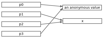// Now, p3 and p0 store the same address.